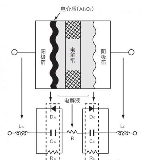 電容的等效電路作為鋁電解電容的電介質(zhì)氧化膜(Al2O3)的介電常數(shù)通常為8~10,這個(gè)值并不比其他類型的電容大,但是,通過對(duì)鋁箔進(jìn)行蝕刻擴(kuò)大表面積,并使用電化學(xué)的處理得到更薄更耐壓的氧化電介質(zhì)層,使鋁電解電容可以取得比其他電容器更大的單位面積CV值。
